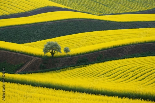 © haiqiang, Fototapeta premium arafed field of yellow flowers with a lone tree in the middle