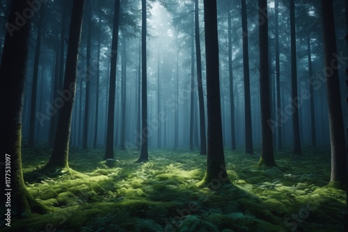 © haiqiang, Obraz premium arafed forest with moss and trees in the fog