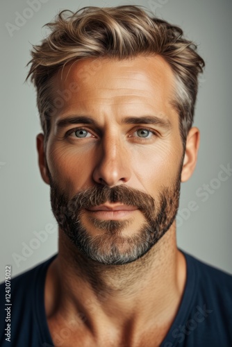 Obraz premium arafed man with a beard and a blue shirt looking at the camera