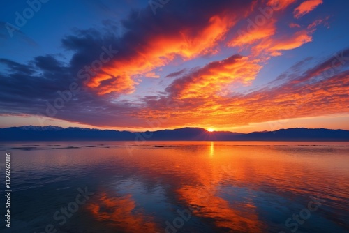 © haiqiang, Naklejka premium arafed sky with a bright orange and blue sunset reflecting in the water