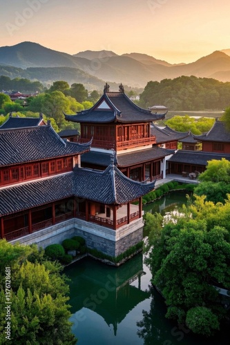 © haiqiang, Fototapeta premium arafed view of a chinese building with a pond in front of it