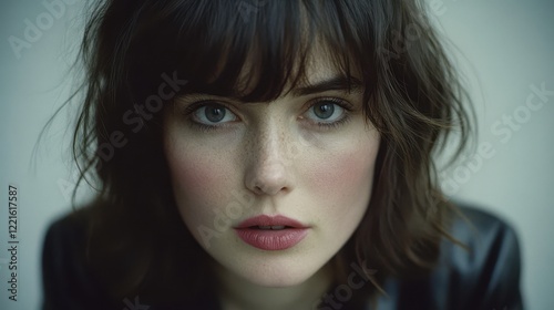 Fototapeta premium Arafed woman wearing a black jacket over a blue shirt, showcasing a blend of...