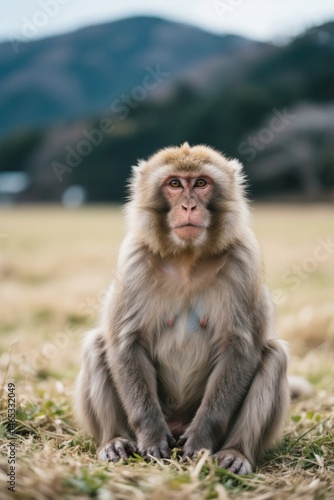 © haiqiang, Naklejka premium araffe sitting in the grass with mountains in the background