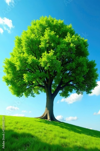 Fototapeta premium Arbol grande con hojas verdes en la mesa al aire libre, paisaje, mesa