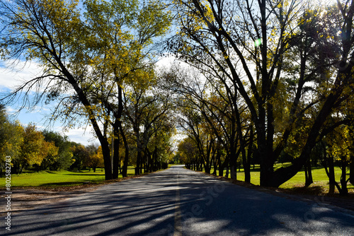© Janet, Naklejka premium Arboles en otoño y carretera. Colores y hojas otoñales, verde, amarillos, rojo