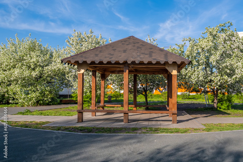 © Сергей Лаврищев, Fototapeta premium Arbor made of wood in the park among flowering trees.
