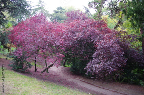Fototapeta premium Arbres rouges , Parc des Buttes Chaumont, Paris, France.
