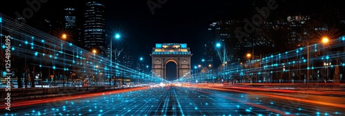 © Ilja, Fototapeta premium Arc de Triomphe in Paris at night with traffic trails and technology network concept overlay.