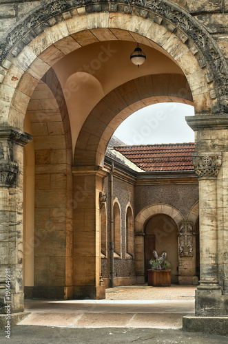 © olsavichev, Naklejka premium Arch and patio of the chapel at the South Cemetery in Leipzig