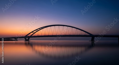 © Ruas, Obraz premium Arch bridge over calm waters at sunset.