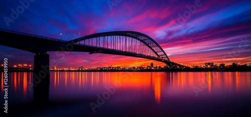 © DYAH, Naklejka premium Arch Bridge Silhouette Against a Vibrant Colorful Sunset Sky Reflection
