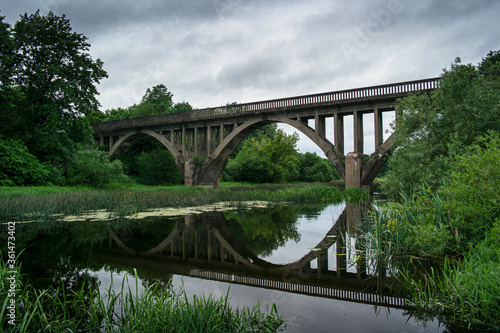 © vytautas, Fototapeta premium Arch bridge viaduct in Lithuania. Transportation train nature travel concept.