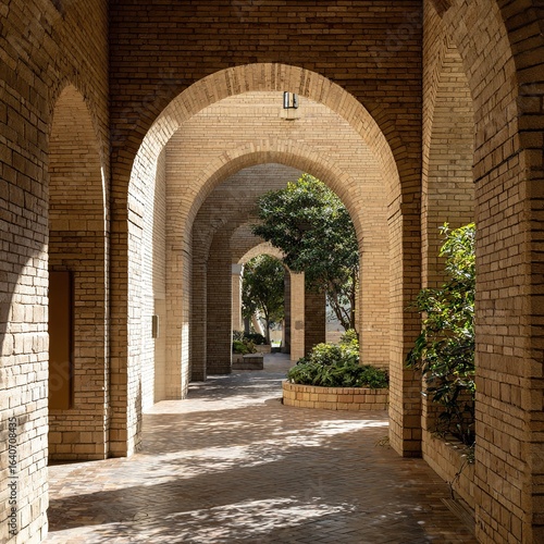 Naklejka premium Arch courtyard landscape: stone structure & plant light-shadow, architectural design