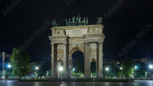 © HyperlapsePro, Fototapeta premium Arch of Peace in Simplon Square timelapse at night. It is a neoclassical triumph arch