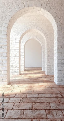 © Almarkha, Naklejka premium Arched, bricked hallway; sunlit floor, white walls/arches