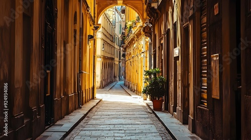 © pkproject, Fototapeta premium Arched Entrance with Hanging Blank Sign in European Street Setting