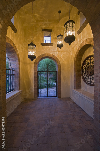 © MDBPIXS, Fototapeta premium Arched hallway with lit hanging lights in modern home