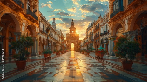 © fotofabrika, Fototapeta premium Arched Passageway in Seville, Spain, at Sunset
