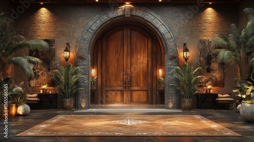 Fototapeta premium Arched wooden door, tropical plants, stone entryway.