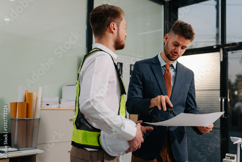 © NINENII, Obraz premium architect caucasian man working with colleagues mixed race in the construction site. engineer architect wearing safety helmet meeting.