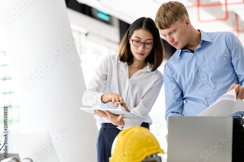 Obraz premium Architect designer engineer team colleagues working with blueprint and tablet in office.