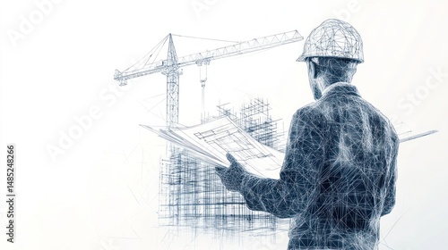 © Rizky, Obraz premium Architect reviewing blueprints, construction crane & building sketch in background
