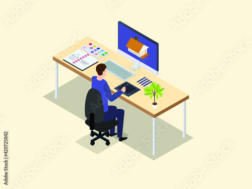 Fototapeta premium Architect working on a new house design 3d isometric vector concept