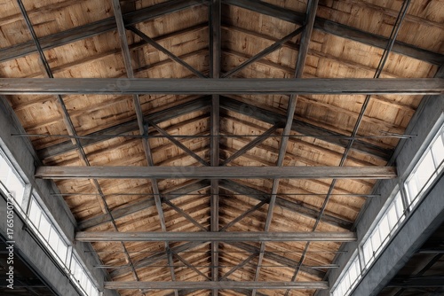 Obraz premium Architectural Beauty of Industrial Exposed Ceiling Featuring Timber and Steel...
