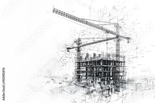 © Valentin, Obraz premium Architectural Blueprint of a Construction Site with Cranes