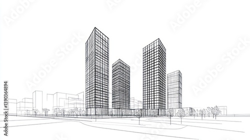 Fototapeta premium Architectural Blueprint of Modern Cityscape, Design of Tall Buildings, urban Planning, potential use for interior design inspiration