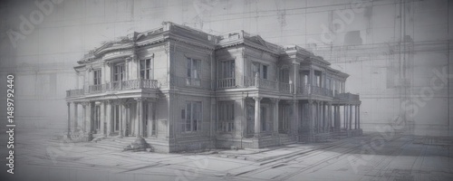 © Kaneki, Obraz premium Architectural blueprint overlay on faded photo, creative visualization of building project , photo, draft