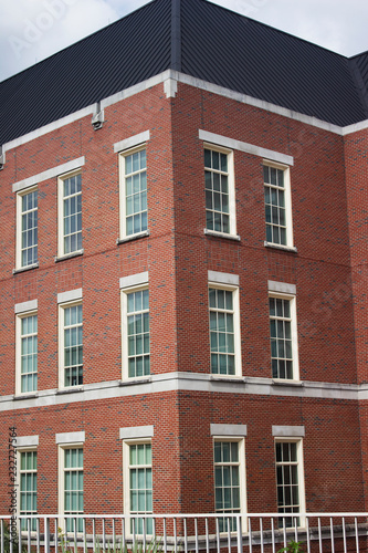 © MyAnLe, Fototapeta premium Architectural brick building with blue roof and white fence