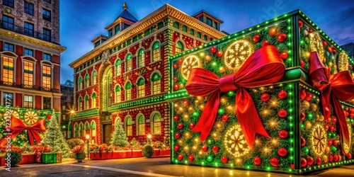 Obraz premium Architectural Christmas: Buildings transformed into giant gift boxes and ornaments.