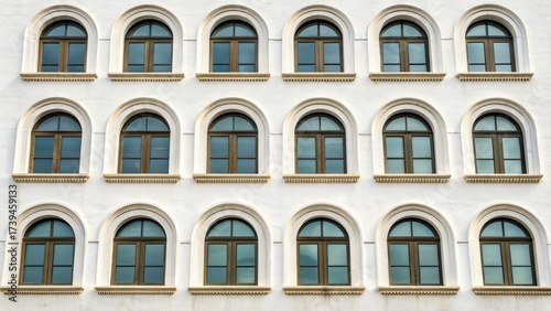 © Farah, Fototapeta premium Architectural close up of arched windows on a white wall featuring symmetrical design elements