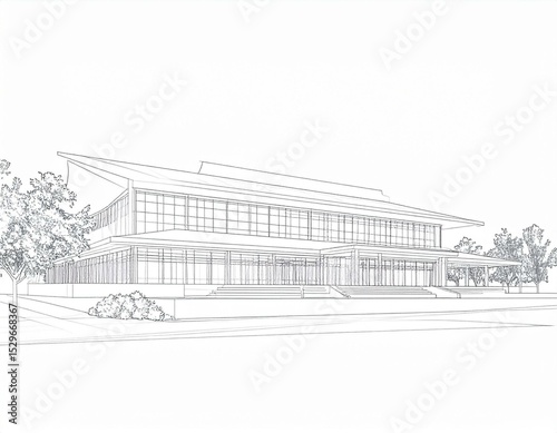 © Pitchaphorn, Fototapeta premium Architectural Design Sketch Modern Building Exterior with Landscaping