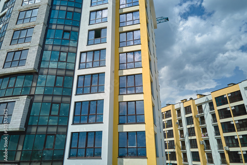 Fototapeta premium Architectural details of modern high apartment building facade with many windows and balconies