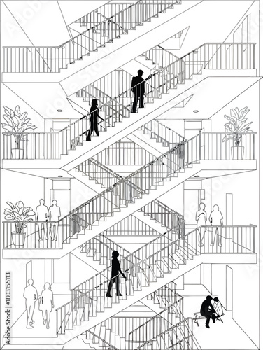 © Authentic, Obraz premium Architectural drawing of a modern building facade with a complex spiral staircase and silhouetted figures ascending and descending