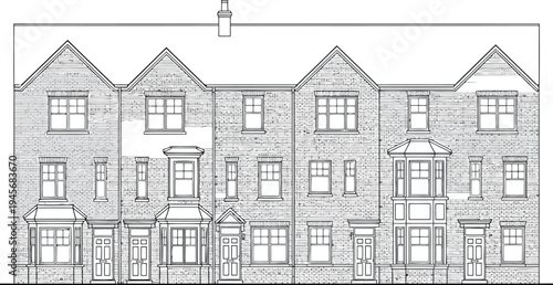 Fototapeta premium Architectural drawing of a multi story building with gabled roofs isolated on...