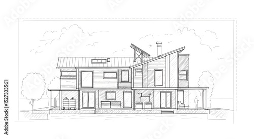 Obraz premium Architectural drawing of modern house design with blueprint sketch and home...