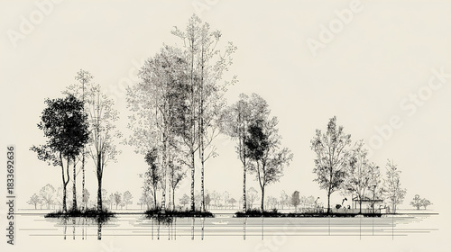 © suldev, Obraz premium Architectural Drawings, Minimal style cad tree line drawing, Side view, set of section wetland forest outline for landscape design drawing. Vector illustration in seperate element Stock Vector
