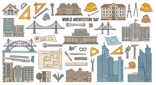 Fototapeta premium Architectural elements and structures in a detailed illustration for architecture day celebration
