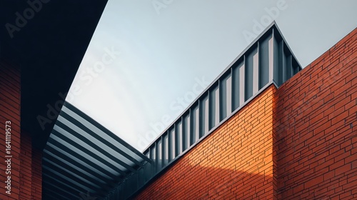 © Generative AI, Fototapeta premium Architectural Geometry: Modern Building Exterior Featuring Clean Lines, Brick Facade, and Geometric Skylight Design with Sky