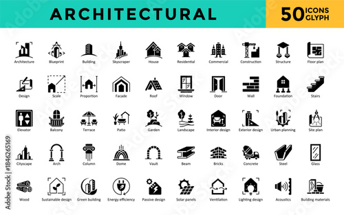 © Gravisio, Naklejka premium Architectural icons set with Energy efficiency, Passive design, Solar panels, Ventilation, Lighting design, Acoustics, Building materials icon. Simple glyph vector