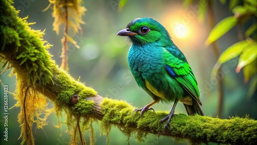 Fototapeta premium Architectural lines frame an iridescent emerald bird, perched on mossy branch.