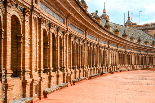 © annaleish, Fototapeta premium Architectural perspective of the ancient part of a red brick building located in Seville's Spanish Square