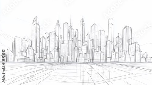 © JUNAEDI, Naklejka premium Architectural Perspective: Urban Skyline Sketch with Skyscrapers and Buildings