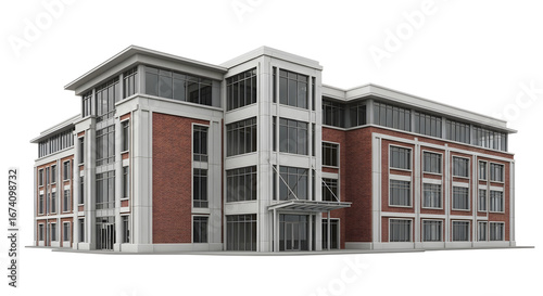 © กฤษณรักษ์ บุตตะนันท์, Fototapeta premium Architectural rendering of a contemporary multi-story business center with a classic brick facade and modern glass windows isolated