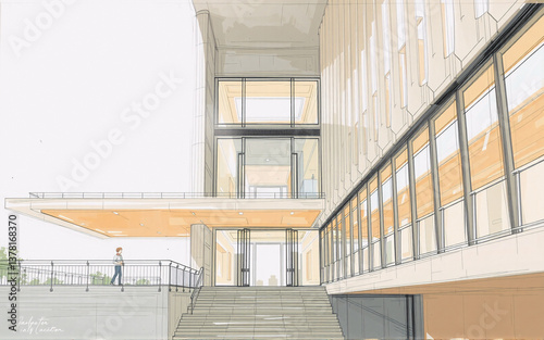 Fototapeta premium Architectural rendering showcases a modern building with large windows and a person on a platform. Clean lines and contemporary design are prominent features.