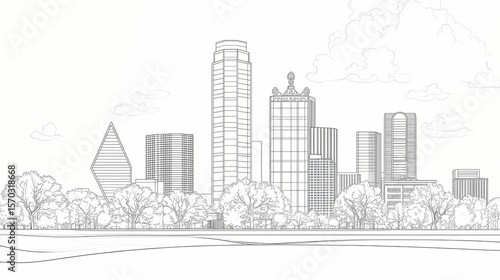 Naklejka premium Architectural sketch of a city skyline with trees.