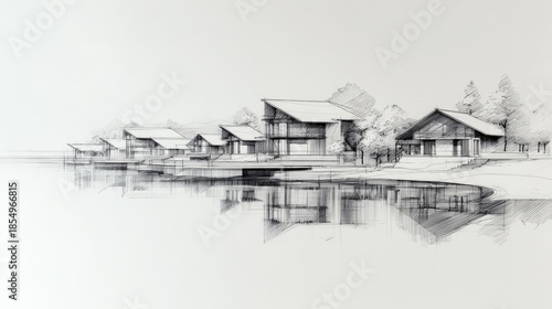 Fototapeta premium Architectural sketch of waterfront homes reflecting in calm water (1)